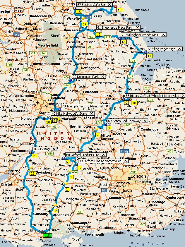 I departed from home on Thursday 31st July and headed north east with overnight stops near Peterborough on Thursday night and near Hull on Friday night. I picked up 8 CDs along the way, Oxford Classic Motorcycles, Oxford Products, Santa Pod Raceway, Riders Cafe, Skeg Vegas Sign, Willingham Woods Kiosk, Shepherd’s Place Farm and Squires Cafe Bar.