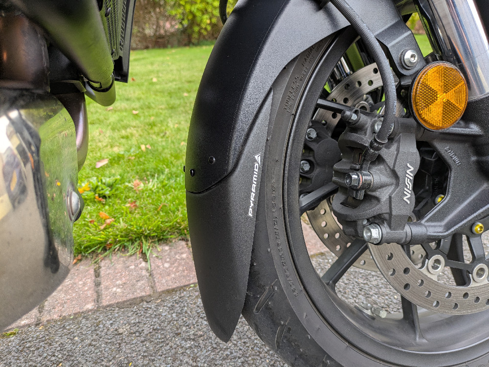 One of the improvements that Honda made over the previous SC84 model was to lengthen the drop of the front fender. I thought that would be sufficient to keep mud and crap off the radiator and the front of the engine. However, after completing a 320 mile trip in very wet and muddy conditions it became obvious that the standard fender needed help so I fitted a Pyramid fender extender.
