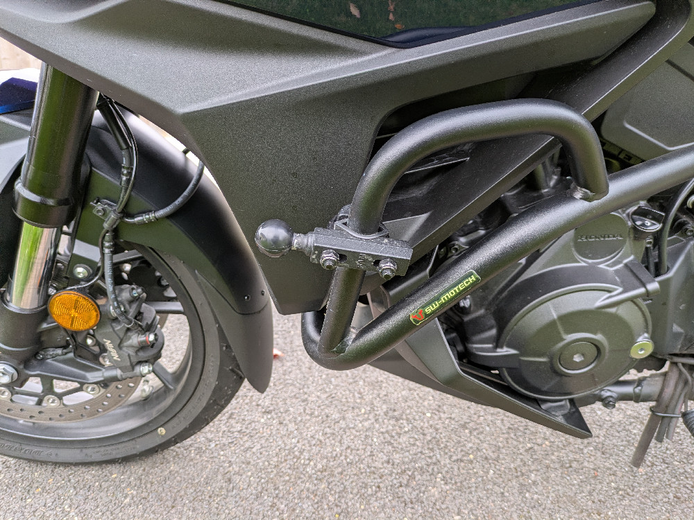 I deliberated whether I wanted to fit crash bars to the NT1100 and for a while I thought not to but it only took one wobble while I was pushing the bike out of the garage to change my mind. There are a few options for a 2025 NT1100 including Heed, Hepco and Becker and SW Motech with Givi working on some (at the time). Heed and H&B make two sets of crash bars, upper and lower crash bars while SW Motech makes just the one set of crash bars. Fitting both upper and lower crash bars probably gives the best protection as it protects both the engine and fairing panels. The single set of crash bars from SW Motech protects the engine but it's likely the fairing panels would suffer some damage if the bike was dropped. However, I didn't like the look of the upper crash bars as it looked like scaffolding around the top of the bike. I did consider just fitting the lower crash bars but I thought they might foul access to the oil filter, etc. So I compromised and went for SW Motech crash bars accepting that they might not fully protect the bike in the event of a drop, I have to say that I'm happy with SW Motech crash bars because they're well made, a good fit and fairly unobtrusive when compared to the alternatives. Fitting the SW Motech crash bars was a bit fiddly as it involves adding a bracket to the frame stanchion that sits snuggly between the exhaust downpipes. (I understand from others that have done it that fitting one of the alternative crash bar options is not so straightforward.) The SW Motech instructions tell you to cut away the rear of the heel guards as the rear of a crash bar bolts to the subframe and interferes with the heel guard. I opted not to do this. I left the heel guards off and fitted some rubber caps over the swingarm ends instead.