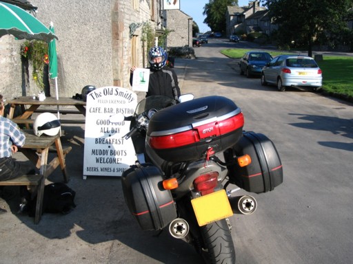 Next day, Friday, we go and take a look at where our lad's being educated. Oh, the expense! It's a very nice place York and we did a bit of shopping in the designer shopping outlet. It's a good job the panniers can't hold too much! We left York and cut across to Darfield where we were fortunate enough to bump into a local councillor. We found the Darfield Colliery Memorial where he said it would be, took our photos and pondered on a nice route to go around Sheffield to get to Monyash. The first bit of the ride from Barnsley wasn't too exciting but we had a really nice ride across the Peak District past Derwent and Ladybower reservoirs (where they filmed the Dam Busters). We took our photos of The Old Smithy and had something to eat there. On the way to our B&B at Longnor, I took Chris to the famous Cat and Fiddle pub just outside Buxton.