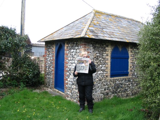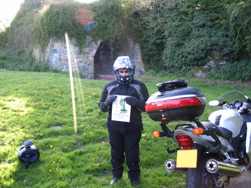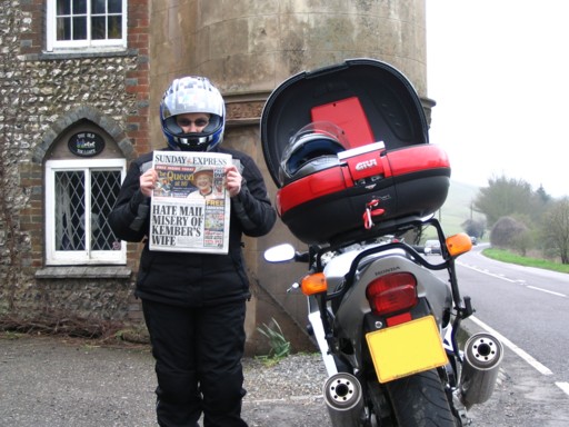 We were not going to make the same mistake as last time. This time I was Googling away the night before looking for Castellated Toll Houses in West Sussex and Gravewatcher's Huts in Hampshire. No problem. The Gravewatcher's Huts were quickly located and, although not explicitly stated as castellated, a Toll House in Findon that had a 'lumpy' exterior was also located. We avoided the M27 on the way up taking the A272 from Winchester to Petersfield from where we cut across to Findon. We were very confident that we would just ride up and snap the Toll House. The only problem was that there was no Castellated Toll House where the web had said it would be. (We think some of you had the same problem.) We rode all around Findon trying to find a local who knew where the dam thing was. Very cosmopolitan place Findon, no locals. Eventually we found a bike clothing shop where we were told it was on the A280. (So, when Dave says a town he means in the proximity of a town?) Seems a guy had asked the same question at the shop the previous week. Guess what? When we eventually got there we found we had left our RBR card at home. We bought a Sunday Express and used that instead. (We hoped Dave was an understanding man.) Deflated we took the M27 home calling in at Havant on the way to take a few photos of the Gravewatcher's Huts. We couldn't get the bike in the same picture as the huts. (After Pepperpot we were up for anything but there were too many grave stones in the way!) We consulted the rules again and found the RBR landmark ritual was a bit different for this situation.