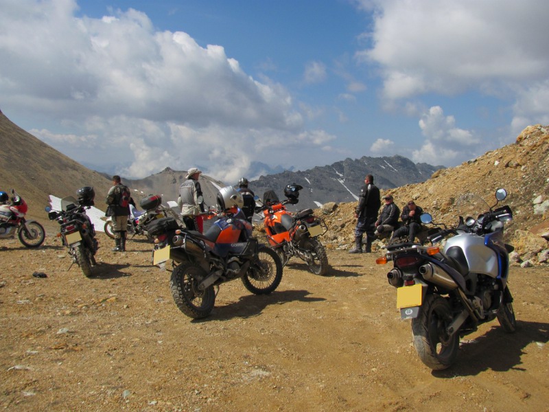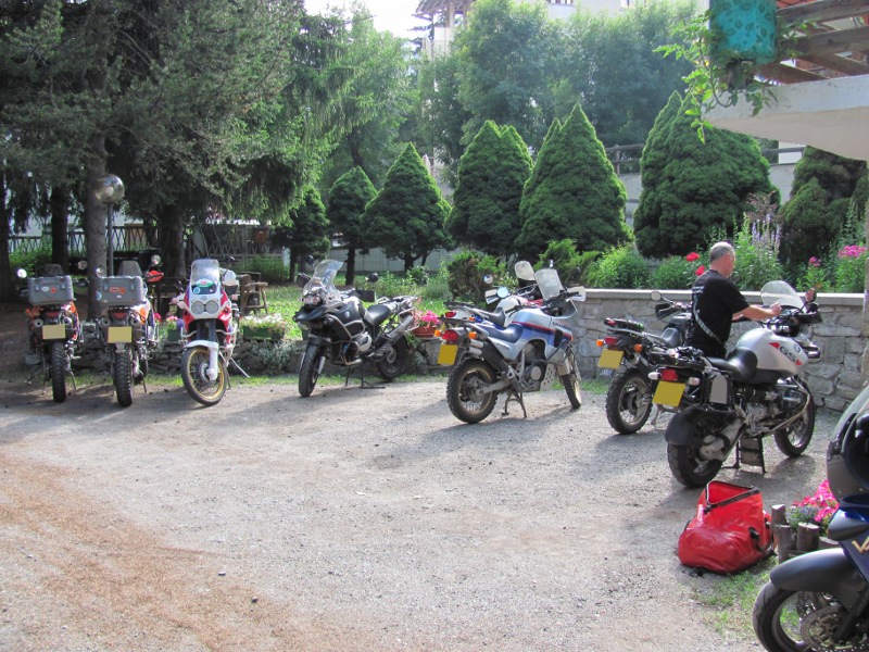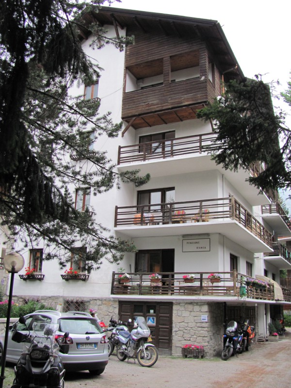 The Sempre Ski hotel turned out very well. The hotel was comfortable and the English couple who run it were very welcoming. There were several other bikers staying at the hotel with us. Two who were riding BMW GS's, a R1200GS and a R1150GS. The 1200 looked to be very expensive being comprehensively kitted out with Touratech gear and gizmos. Another six were riding a mixture of KTMs, Africa Twins and a lone Transalp. (They clearly weren't GS types.) They have gotten together on the XRV Honda Trail Bike forum to ride to the Alps and to do the Stella Alpina rally. Four of them were from the Bath and Bristol area with one from south Wales and one from Cumbria. As we were riding a Honda Varadero they adopted us.