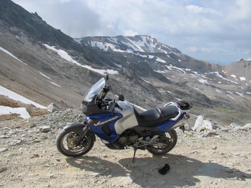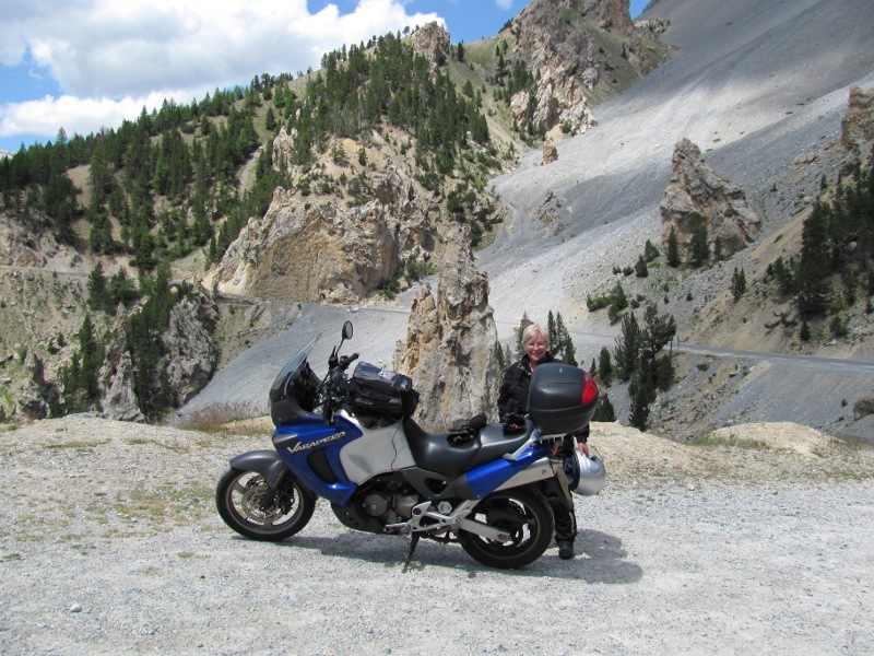 It's around 16 miles to the Col de Sommelier and the tarmac disappeared after about 4 miles after passing through the small village of Rochemolles. The tarmac was replaced by a dusty rutted dirt track strewn with sizeable rocks. The old Varadero bucked around as I tried to avoid the larger rocks and the ruts. Once again I wished I'd fitted crash bars. At the 10 mile point we came across the campsite where those hardy types had camped the previous night. After passing by the campsite the track rose steeply zigzagging back and forth up the mountain. The 360 degree switchbacks were proving to be difficult and it was at one particularly rock strewn dust bowl of a switchback that we thought about giving up. A guy on a GS had just turned around because he'd had enough and we were stuck in the loose earth looking over the side of a sheer drop. Anyway defeatism quickly passed and I told Chris she had to get off and push. With a lot sweating and pushing we managed to get the Varadero around the switchback. Chris remounted and we carried on.