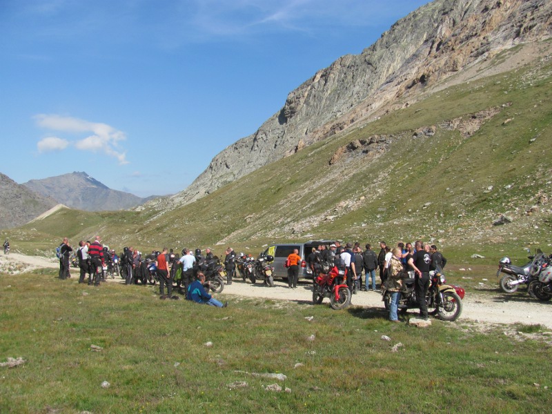 Fortunately none of the other switchbacks were quite as bad. We eventually arrived where the enterprising Italian who runs the Stella Alpina rally had gone as far as he could in his van. He was selling souvenir medals and refreshments. I think we paid 35 Euros for two small medals and a can of Tango! He just knew we had to buy a medal after making the trip.