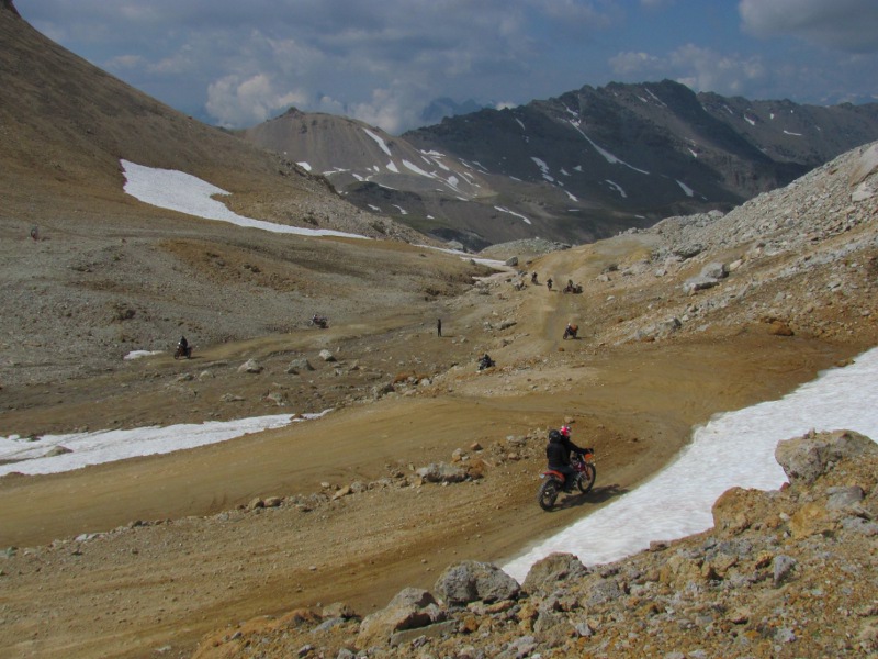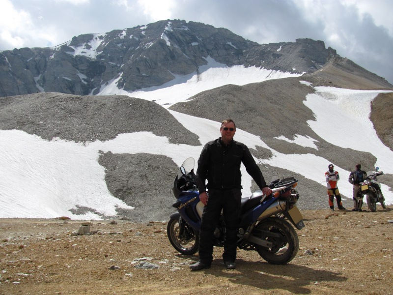 That was as far as we intended to go as far as we needed to get our medals and for many that's as far as they go. However, the XVR boys had now caught us up and we're egging us to go to the top. Carrying on two-up on the Varadero to the top didn't seem like a good idea so I left Chris and carried on by myself to the top. After more dust, dirt, rocks, zigzagging and switchbacks I eventually got almost to the top when I found the track was blocked by a large amount of snow. A lot of people had gathered at that point as that was as far as they intended to go. I was about to do the same and turnaround when the XVR boys, who had got there ahead of me, instructed me on how to get around the snow. Before I knew it, I've left the track and I'm riding along a very rocky melt water stream.