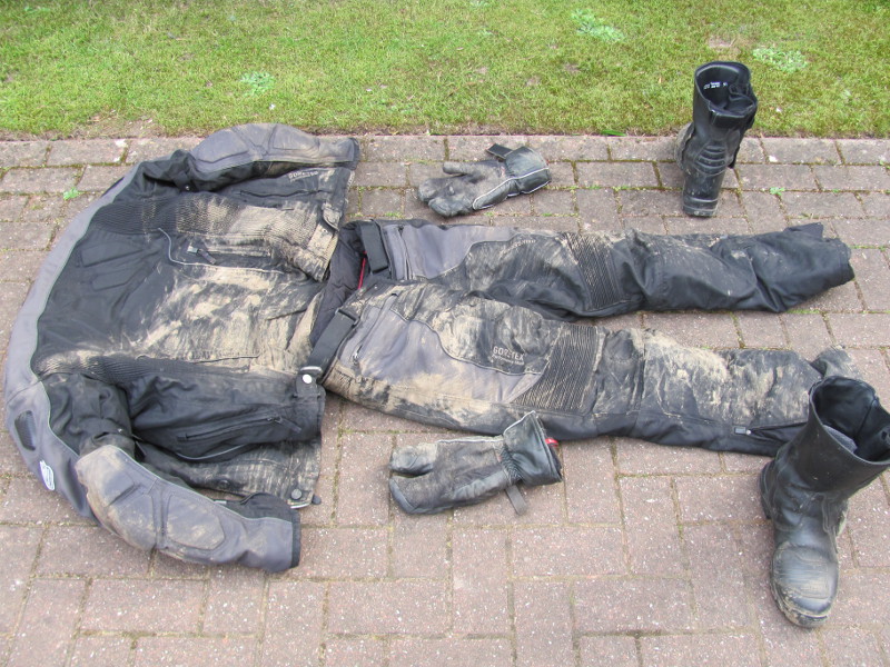 When I got home I immediately called the Sherborne police to report the incident and to advise them of the hazardous state of the A3030. Disappointingly they did not attend. The joke goes that when I got home I told Chris, my wife, that I had an accident and she had replied that she knew because she could smell it from where she stood. She made me take off my gear and leave it in the garage that night. Boy did I honk! The next day I took photos of the Vara and my gear. Both were badly beaten up but the Vara had got me home and my gear had saved me from serious injury. I also visited Poole A&E as my left hand was very swollen and painful. Turned out to be badly bruised.