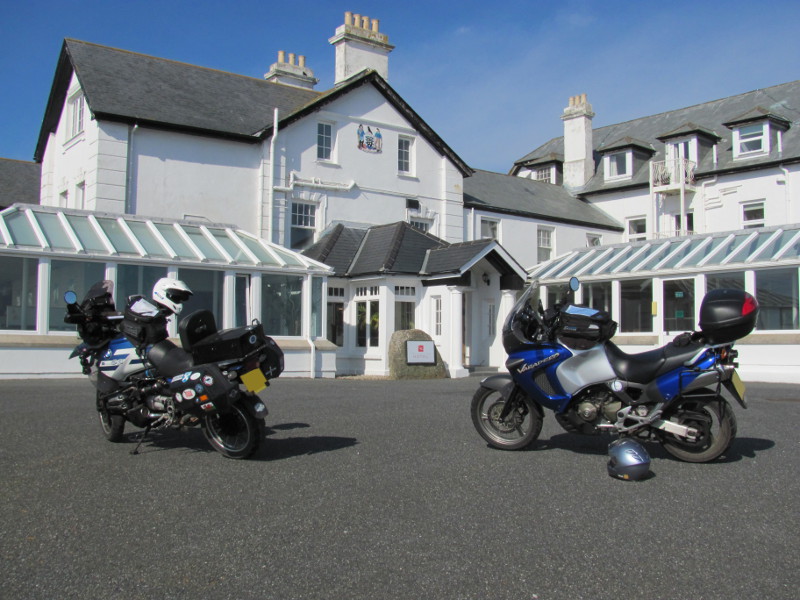 After Princetown we headed west leaving Cornwall for Devon to our third and final manned control at Perranporth picking up another 2 controls and an RBR along the way. We rested up at Perranporth where Rob has a sizeable fan club then it was on to Land's End picking up another 3 controls along the way. Rob's old GS suffered a bit of fuel starvation along the way but it picked up again. At Land's End we had our Transit/Verification forms stamped by the good people at the Land's End Hotel's reception to verify we had been there. As you can see from the photos, the weather was gorgeous. Visibility was very good and you could see for miles. We parked up and took in the rays and took a few photos of Grim's Brit Butt winning GS and my old Vara. Grim's not feeling so good by now but being the trooper he is, he suffers in silence and keeps going!