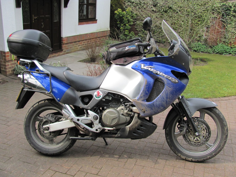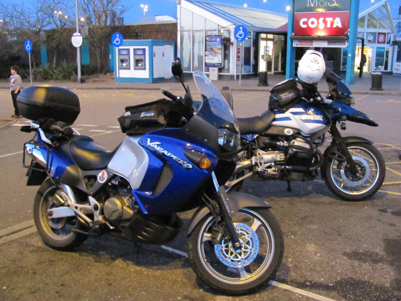 We've got a fairly straightforward run in to the finish at Langport. Up the A38 and M5 taking in one more way point at Chudleigh. This is just as well as poor old Grim is looking fairly rough by now. We stop at Exeter services so that Grim can change his sun visor for one he can see through with dusk approaching. The photo shows the old Vara there looking her finest with Grim's GS just behind it. Unfortunately she didn't stay like that for long.