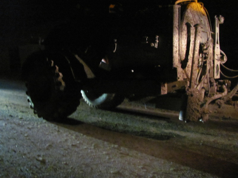 It turned out that a farm contractor was out spraying the fields with slurry at 11 pm on a Saturday night when it was pitch dark. The contractor's boys emerged from a field after I got to my feet and I was able to snap photos of them driving a tractor pulling a slurry tank along the A3030. I also snapped some photos showing the state of that section of the A3030. They helped me get the old Vara back up and a beaten up old Vara and me made the last 20 miles back home. Not easy with a bent brake leaver, a bent brake pedal and various right hand bits flapping around.