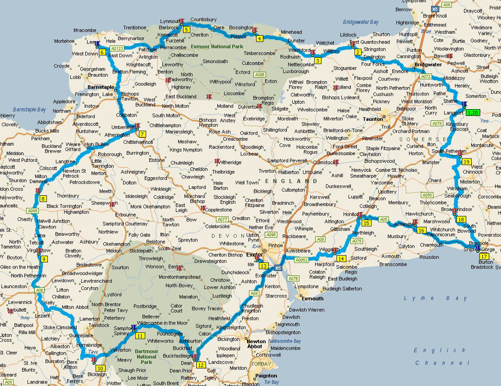 Basically what's needed for a gold award is to start and finish at Langport and, in between, visit 3 manned controls and 15 unmanned controls answering the question pertaining to each unmanned control and a set of questions at each manned control. As far as the manned control questions went, it was good to know a bit about Somerset cider. (It's meant to be a bit of fun.) This year our route was Langport, Kilve(24), Allerford (01), Lynmouth (25), Ilfracombe, Umberleigh (40), Holsworthy Beacon (20), Milton Combe (26), Chapmans Well (11), Princetown (26), Buckfastleigh (06), Ide (22), Tipton St. John (36), Honiton (21), Axminster (03), Eype, Birdsmore Gate (04), Seavington St Michael (3) and Langport. The three manned controls (open between 10am and 6pm) being Ilfracombe, Princetown and Eype. So an anticlockwise route starting with going west along the north Somerset and Devon coastline, then south along the Cornwall and Devon border down to Dartmoor and then finally back east passing through Dartmoor and Dorset to Langport.